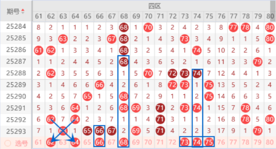 该区间62 64 78 80号数字都是属于交叉对称号码,本期应该是有号码开出来的,其中的62 64号数字我们可以重点关注一下出号情况。上期开出了65 66 67号数字的三连号,本期我们注意一下出一个重号的情况,其中的66号数字可以重点关注一下出号情况。夹号68 70号数字也是要注意出一个号码的情况,其中的68号数字可以重点关注一下。本期的73 74号数字我们注意一下落下一个号码的情况,其中的74号数字可以重点关注一下。