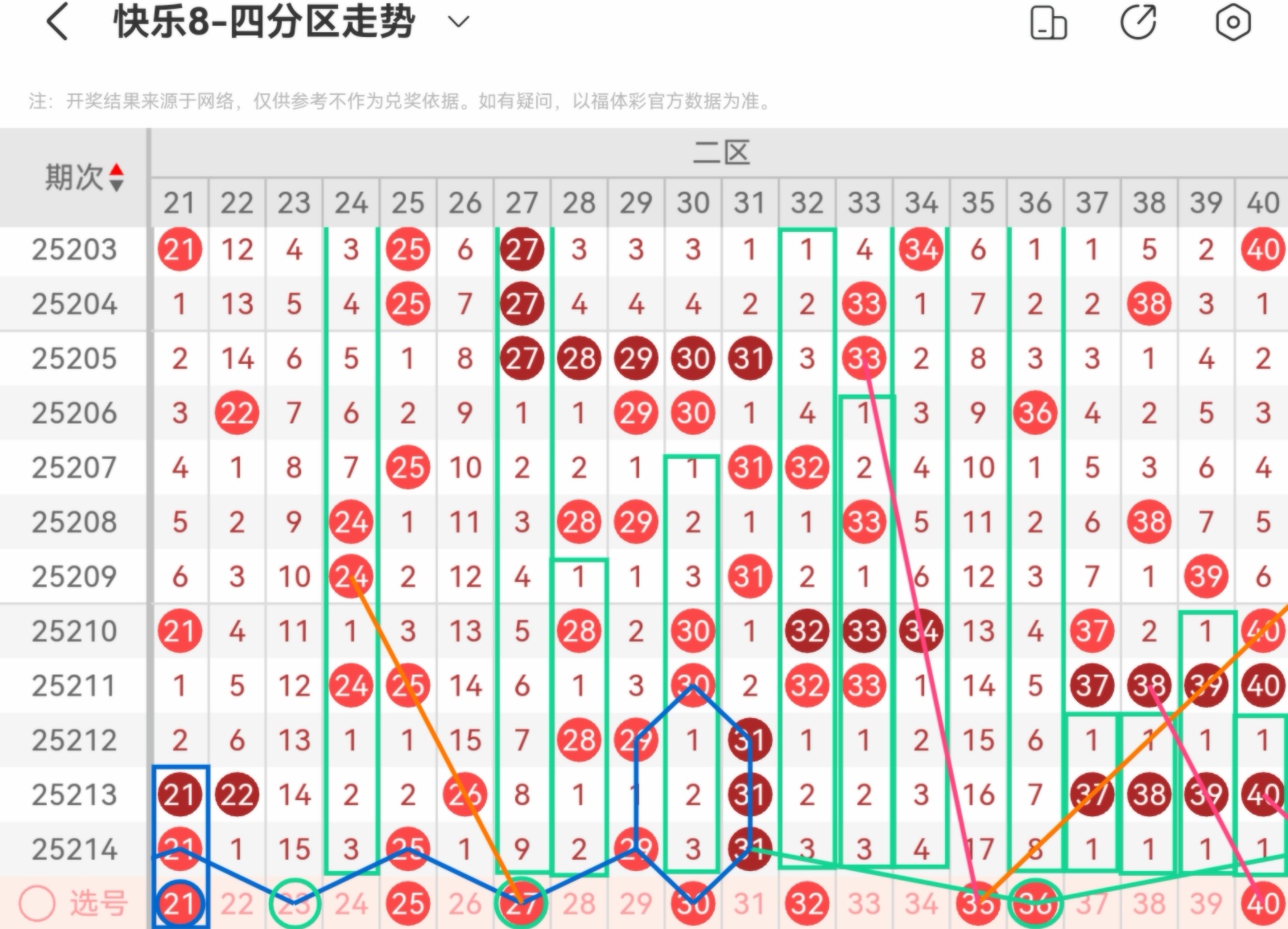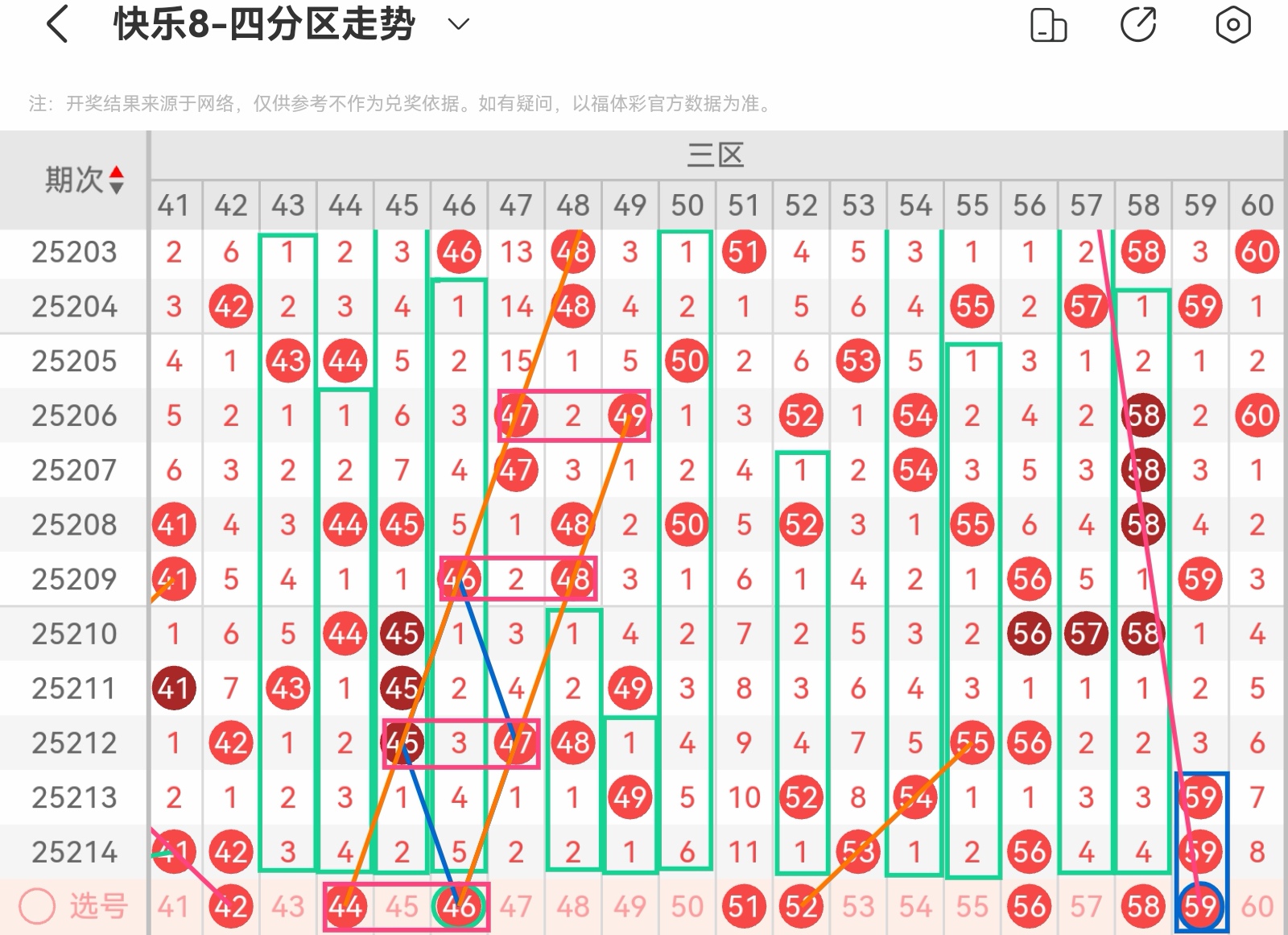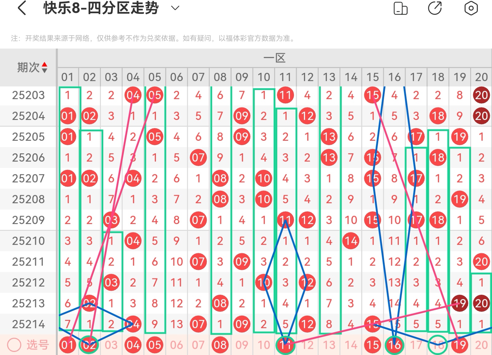 大家好,我是甜丝丝的坏事,主要以快乐八的形态走势、空位走势、遗漏走势以及斜连走势相结合的方法,用公认的四分区走势来进行预测分析,希望能让你有所收获。