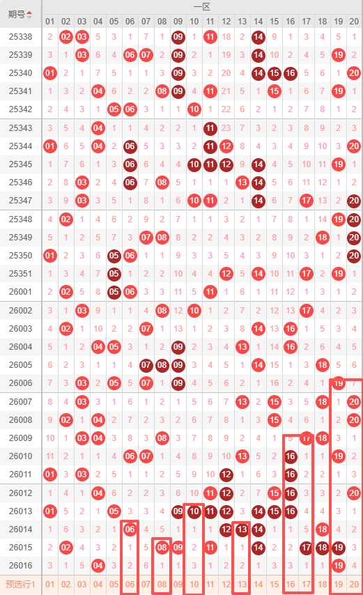 一区:最近一区10期出号情况为:5 4 5 5 4 6 9 5 8 2,总出号情况为53个,平均出号5.3个,本期一区号码推荐出号为:06 08 10 13 16 17 19 20。重点关注:06 08 10 13 16 17 20。