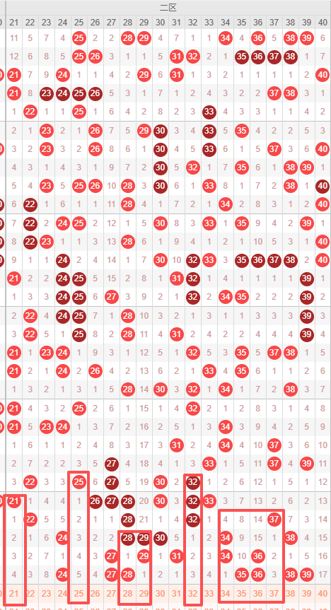 二区:最近二区10期出号情况为:3 4 3 4 5 7 4 6 5 7,总出号情况为48个,平均出号4.8个,本期二区号码推荐:21 25 28 29 32 34 35 36 37。重点关注:21 25 28 29 36。