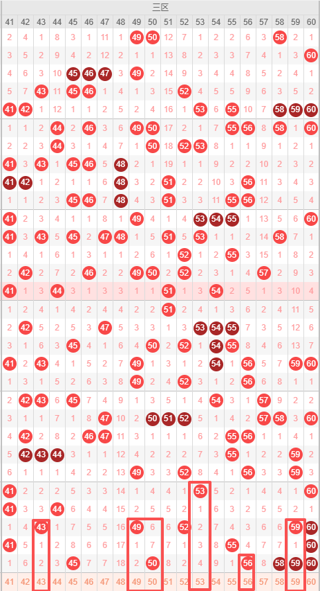 三区:最近三区10期出号情况为:5 7 5 5 4 3 2 5 3 6,总出号情况为43个,平均出号4.3个,本期三区号码走势推荐:43 49 50 53 56 59,重点关注:49 50 53 56。