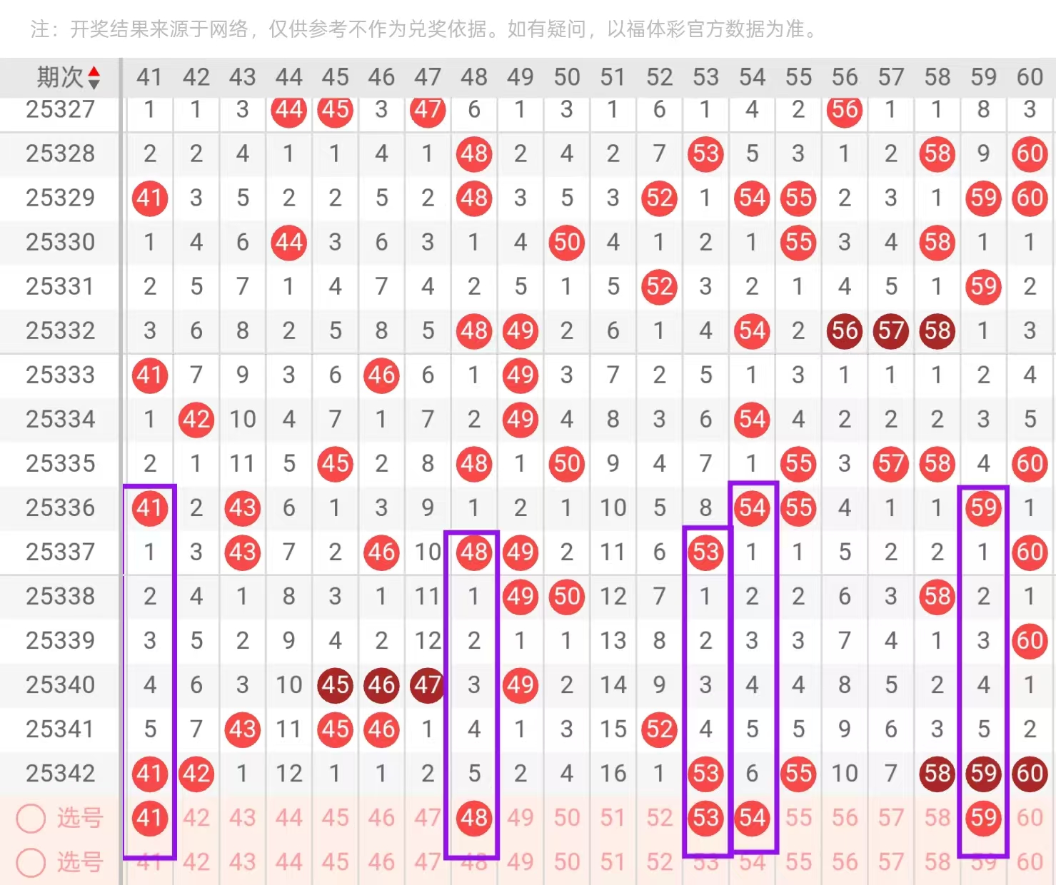 三区41-60:三区间,上一期出现了大面积的回补,总体回补了7个号码的下落,从近期三区号码下落点位来看,呈现出了由冷转热的形态,今天我们要重点关注的是三区间空缺位置的下落和重码的回补,在4头,首先我们要重点关注的是41-42同开重码的一个下落和48-49-2下一的选择,这里可用41-48的搭配和41-49的搭配,回到5头位置,今天这里我们要重点关注的是53-55同开重码的一个回补,和58-59-60-3下的一个落号点位,这里可用55的55-59的搭配,这这里重点关注的是开出对子下落的可能。