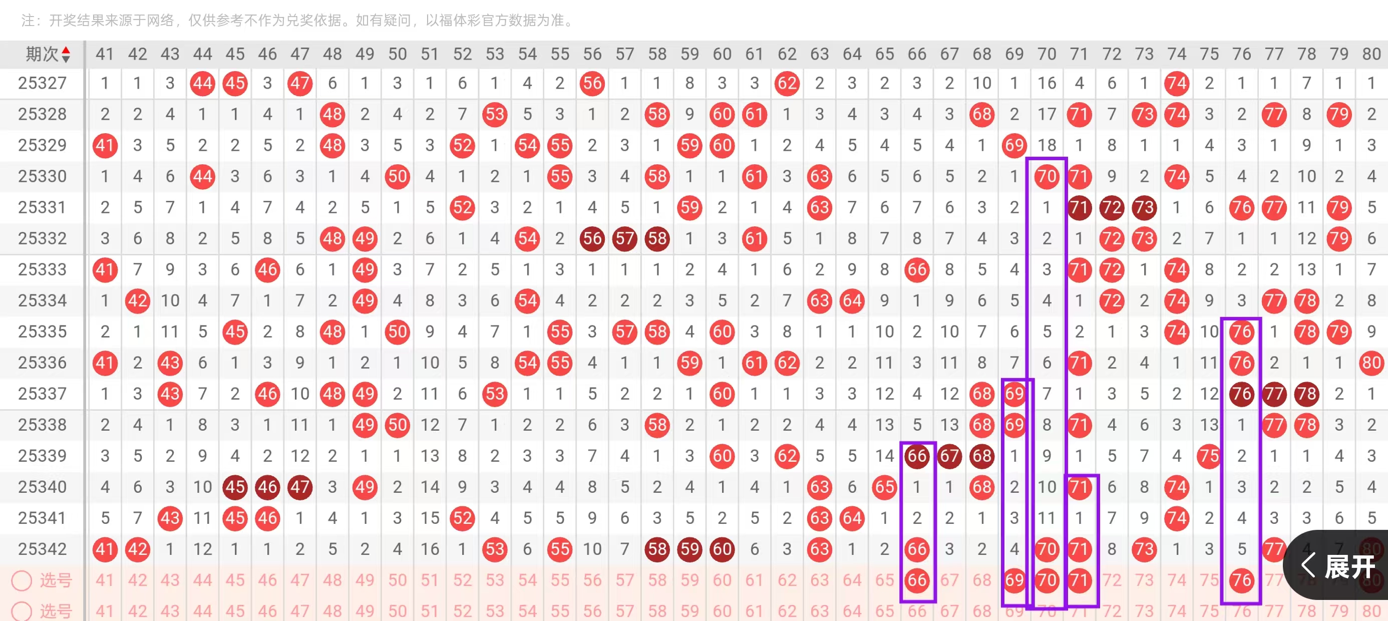 四区61-80:四区间上一期出现了大面积的回补,总体回补了7个号码的下落,从四区间号码定位来看,呈现出了由冷转热的形态,今天我们要重点关注的是四区间空缺位置的下落和重码的回补,在六头,首先我们要重点关注的是63-66同开重码的一个下落和69-70-2下1的选择,这里可用66-69的搭配和63-70的搭配回补,回到7头位置,今天要重点关注的是75-76-2下1的选择,和77-80同开重码的一个回补,这里可用76-80的搭配和75-77的搭配回补。
