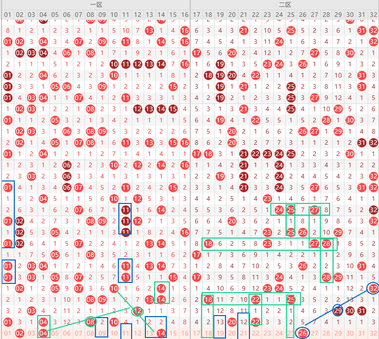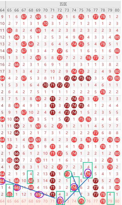 边号66 68 70 72 76 79出1-2码,重号65 69 71 77 78出一码,本期五区有重号优先78,形态上72 75是斜连号,遗漏值隔4期号出多期,上图已勾画,本期隔4期号72 79二出一,7尾8尾最热防67,关注五码67 69 72 75 78双胆78 75