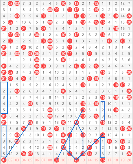 快乐8第2025264期01-20区域,我们可以看到01间隔对称走势,以及05-03-01的走势,然后就是09.12.16的走势,如上图所示,大家可以根据自己的思路与习惯进行选择