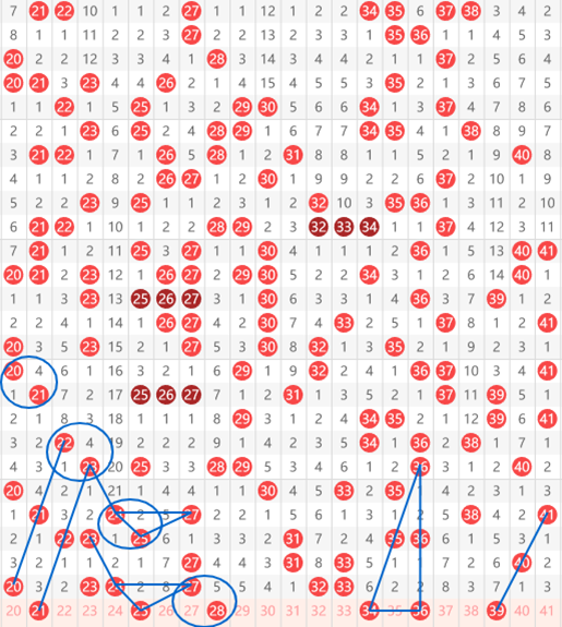 快乐8第2025264期21-40区域,我们可以看到21的走势 如山图所示,22间隔两期出21再间隔两期出20的走势,同时23的走势完全相同,可以参考,25号与28号如上图所示一个是形态复刻,一个是斜连延伸,34跟36很明显的三角走势,而39是个傻瓜斜连,大家可以根据自己的习惯与思路进行选择。