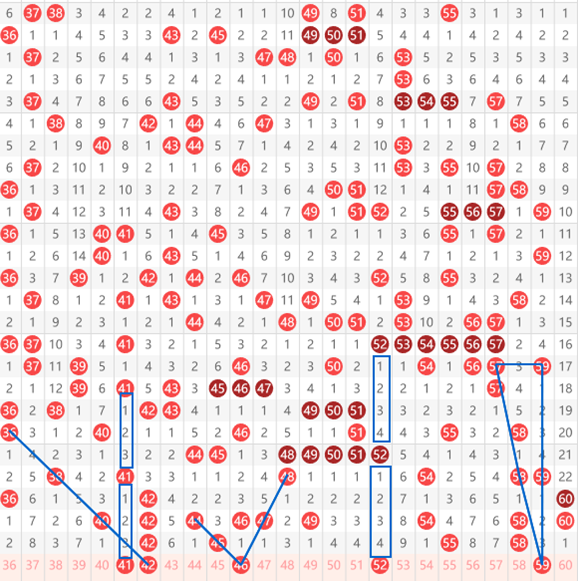 快乐8第2025264期41-60区域的推荐如上图,这区域推荐号码比较多,间隔对称的,例如41号的间隔对称,52号的间隔对称,还有间隔斜连的,力图36-40的那条线所指示,还有48-46的间隔斜连,57-59的间隔斜连,还有59号的倒三角走势,具体的请根据自己的思路选择,或者17点到直播间,听主播的详细解答。