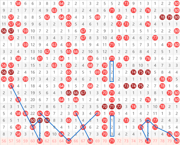 快乐8第2025264期61-80区域的推荐如上图,这个区域号码推荐的比较集中,首先是61.65.68的集中出号区域,都是斜连号码,同时看到71的间隔对称,以及后面的76跟80两个号的走势,我们看到线条的标注,这区域放置连码,个人感觉很可能开出三连码,具体选择请根据的自己的思路确定