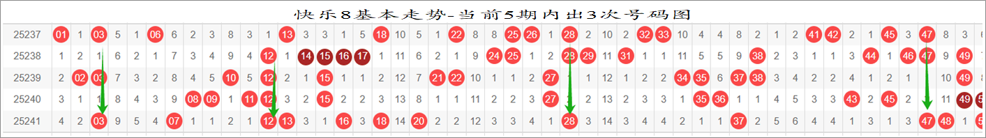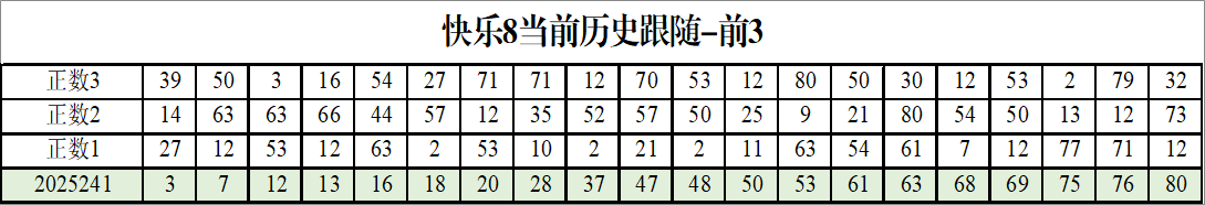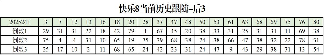 我感觉选热的同时,还要注意防冷条件开出,可以直接选取每个号码跟随出次前三的号码,也可以考虑把出次最后的三个数字加进去,不过这样可能号码太多,可以尝试。图上也能看出单独号码跟随的情况,我就不一一统计每个号码的出次了,我这里考虑提高概率,取每个号码历史跟随的前三号码和后三号码,根据2025241期的号码,我关注正数3和倒数3的号码号码为:
