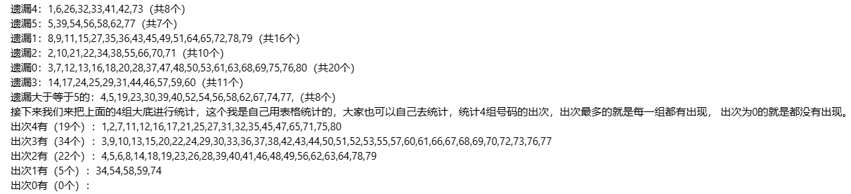 如果把对数和补数合起来有40个号码,中间可能还会产生一下重复数,通过近几期的统计分析,以上期数据进行补数对数计算推算下一期的概率不高。为提高概率,我主要是用前两期的数据来进行对数补数推算,然后再组成一个集合,作为我的第四组大底号码。
