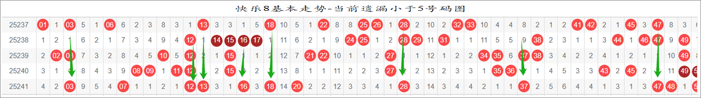 所以这个条件值得关注,从号码分布图上我们可以分析出,遗漏小于5期的号码有: