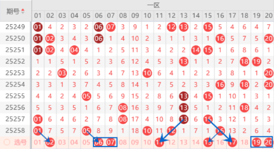 该区间的02 03号数字我们注意一下出一个号码的情况,本期也是可以防守一下同出的情况。本期的06号数字我们注意一下出号情况,毕竟上期开出了05号数字,本期是有机会把06号数字带出来的。本期的11 14 17号数字是属于1路号码,已经断号7期了,本期是有机会出一个号码的,其中的11 17号数字我们可以重点关注一下出号情况。本期的15号数字是属于空一对称号码,本期是有出号机会的,我们可以防守一下15 19号数字同出的情况。