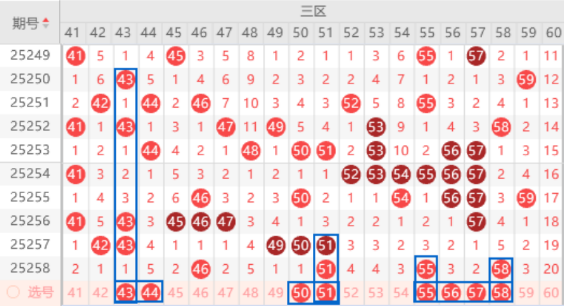 该区间的43号数字我们注意一下出号情况,属于131走势,出号机会是有的,本期我们可以防守一下43 44号数字同出的情况。本期的50号数字是属于空一对称号码,出号机会是有的,我们可以关注一下50 51号数字同出的情况。上期开出了55 58号数字,本期我们注意一下出一个重号的情况,其中的55号数字我们可以重点关注一下。本期的56 57号数字我们也是注意一下出一个号码的情况,其中的57号数字我们可以重点关注一下。