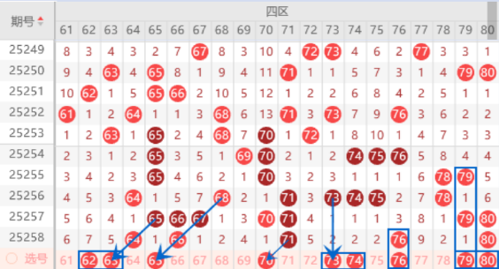 该区间的62号数字是属于斜连号码,出号机会是有的,我们可以关注一下62 63号数字同出的情况。本期的65号数字是属于梅花号码,本期我们防守一下出号情况。本期的70号数字也是有出号机会的,我们可以防守一下出号情况。三连号73 74 75号数字已经断号2期了,本期我们注意一下回补号码的情况,其中的73 74号数字我们可以重点关注一下。本期的80号数字我们防守一下出现三重的情况,本期可以防守一下79 80号数字同出的情况。