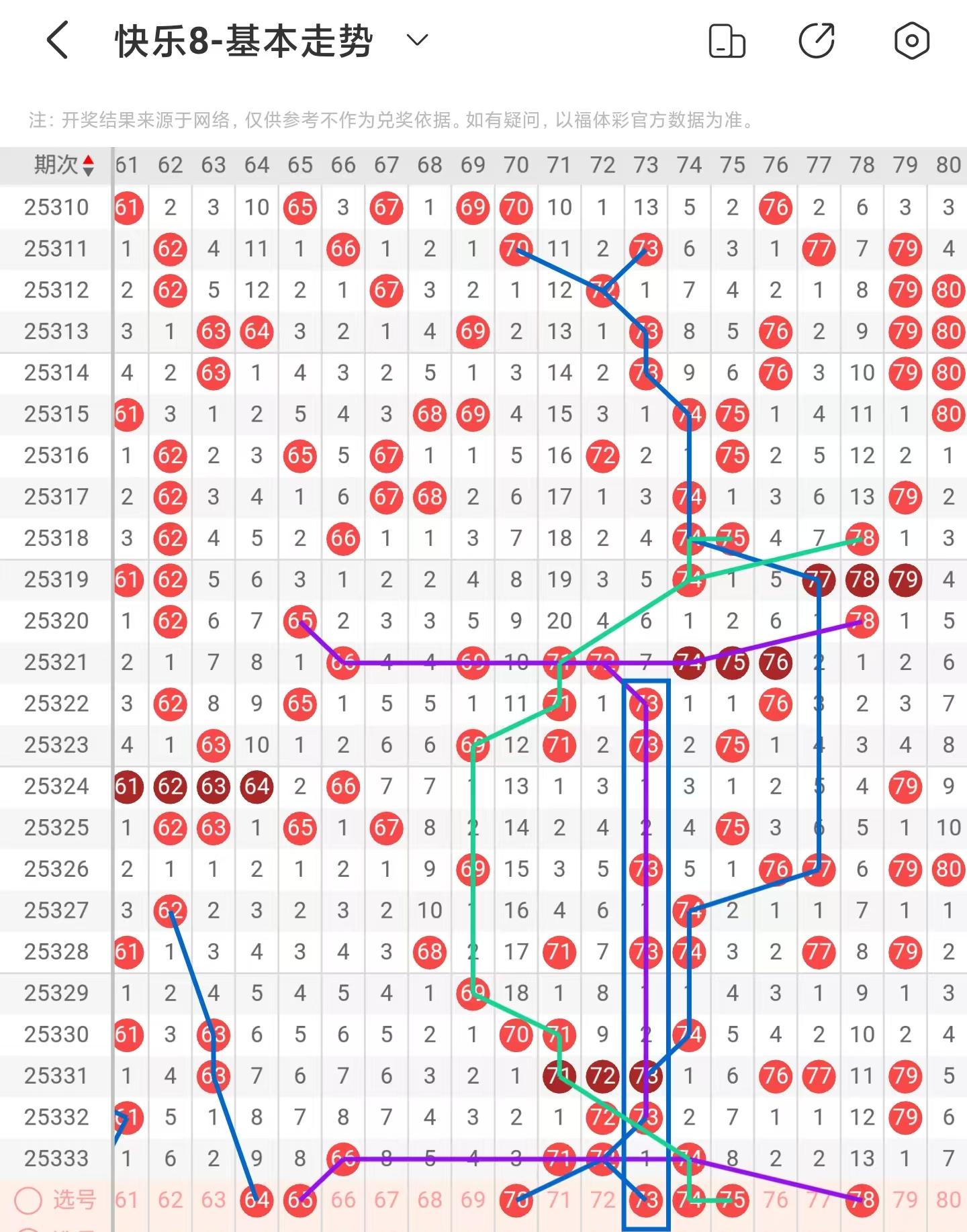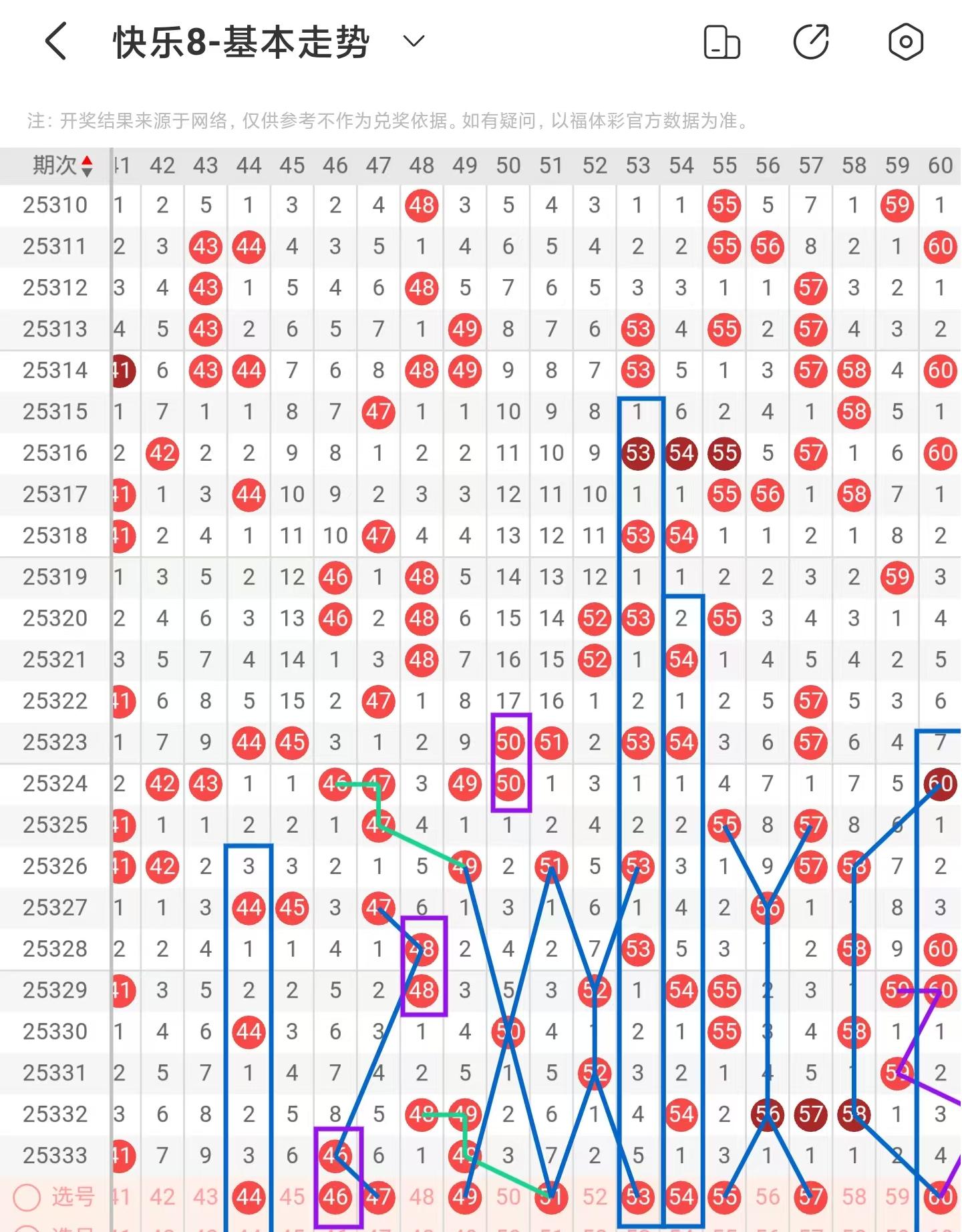 回顾上期开奖号码,期数增减法的五个号码球只开了一个,所以近期注意期数增减法号码球可当杀号,同时注意少量回补,注意本期期数增减法号码球的数量保持稳定,本期的期数增减法号码球为06-07-25-26-55-59。