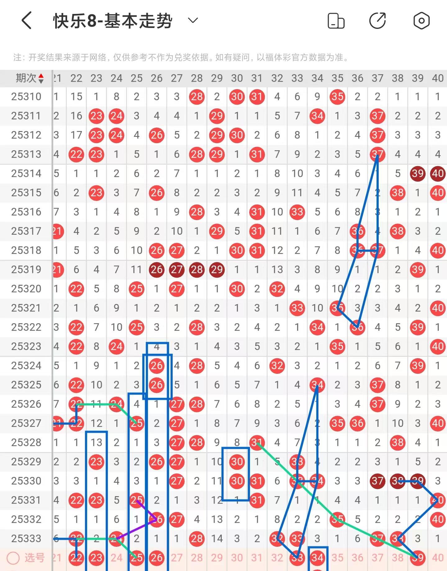 二区间上期大面积增加落号,一共开出七个号码球,本期考虑减少号码球的数量,注意百期相似形态的23号码球,注意隔期递减的25号码球,注意25号码球也是百期相似形态,近期22、24号码球同期下落,下期回补22、25号码球,注意隔期递减开出的26号码球,注意近期32、33、34号码球与35、36、37号码球的走势相似,本期注意33号码球,注意阶梯落位重码走势的34号码球,注意斜连走势回补的39号码球,同时39号码球也是百期相似形态号码球,注意隔期对称回补的40号码球,因此二区间关注24-26-33-34-39。注意本区间的选二复式24-34-39。