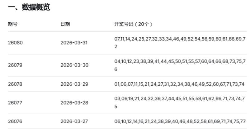 区间轮动特征:当某一区间出号偏少时,下一期常出现回补。如26079期21-40仅3个,26080期该区间增至6个;26079期41-60出现7个,26080期回落至4个。