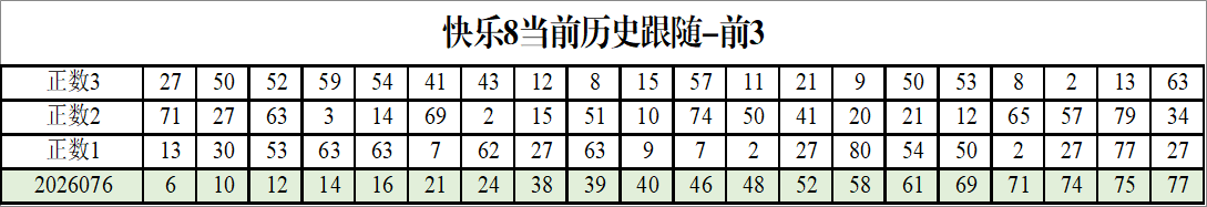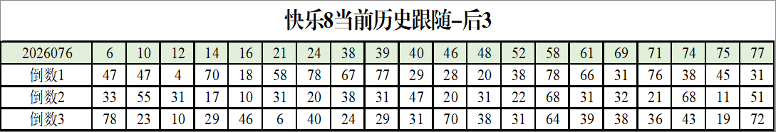 我感觉选热的同时,还要注意防冷条件开出,可以直接选取每个号码跟随出次前三的号码,也可以考虑把出次最后的三个数字加进去,不过这样可能号码太多,可以尝试。图上也能看出单独号码跟随的情况,我就不一一统计每个号码的出次了,我这里考虑提高概率,取每个号码历史跟随的前三号码和后三号码,根据2026076期的号码,我关注正数3和倒数3的号码号码为: