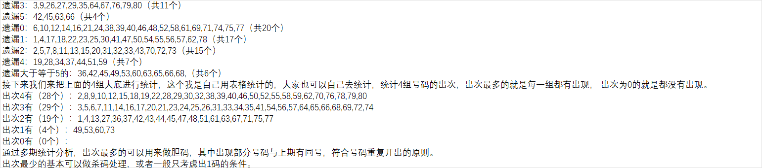 如果把对数和补数合起来有40个号码,中间可能还会产生一下重复数,通过近几期的统计分析,以上期数据进行补数对数计算推算下一期的概率不高。为提高概率,我主要是用前两期的数据来进行对数补数推算,然后再组成一个集合,作为我的第四组大底号码。