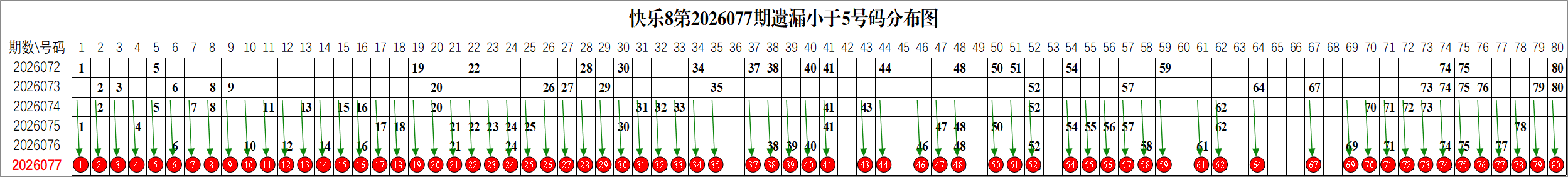 所以这个条件值得关注,从号码分布图上我们可以分析出,遗漏小于5期的号码有: