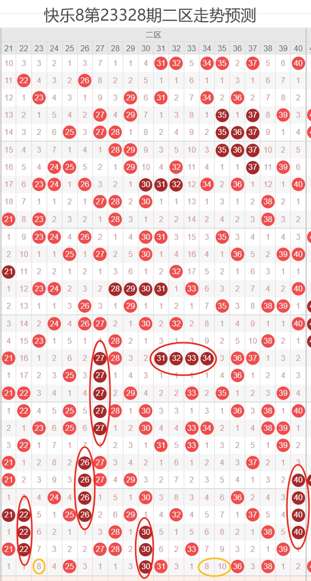 通过对往期30期数据分析,二区热号为:30(出现12次)28(出现10期)36(出现10期)40(出现10期);冷号为:34(出现5期);遗漏号为:23(8期未出)34(8期未出)35(10期未出)。冷热号出现相对较平均,热号22、26、27、40有连落走势,冷号逐期回补,4期或6期以上不出现的号码,防止回补。