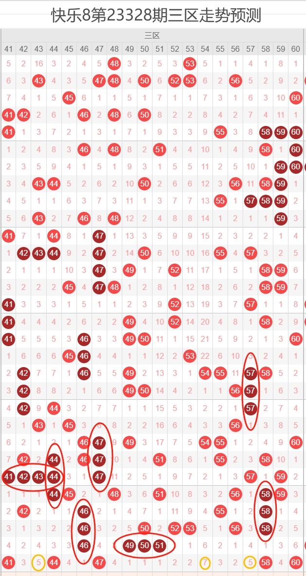 通过对往期30期数据分析,三区热号为:46(出现11期);冷号为:45(出现5期)52(出现5期)51(出现4期)53(出现4期)54(出现2期);遗漏号为:54(7期未出)575期未出);连落号码为:44(连出3期)46(连出3期)47(连出3期)58(连出3期)。温号频繁出现,遵循由冷变温变热原则。8期以上不出现的号码,防止回补。