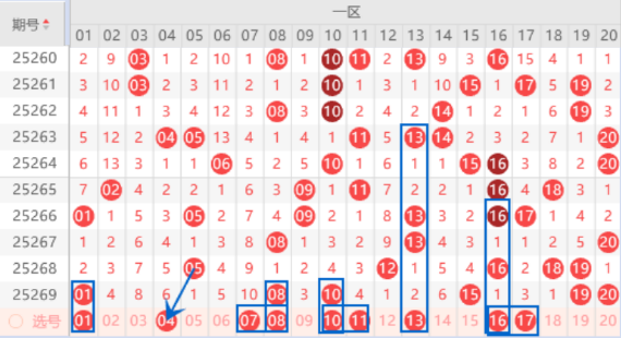 该区间的01号数字我们注意一下出重号的情况,本期是有机会出号的,本期可以防守一下01 04号数字同出的情况。上期开出了08 10号数字,本期我们注意一下出重号的情况,其中的08号数字可以重点关注一下,本期可以防守一下07 08号数字同出的情况。本期的11号数字是属于对应三斜连号码,出号机会是有的,我们可以关注一下。本期的14号数字是属于对应三斜连号码,出号机会也是有的,我们可以防守一下14 16号数字同出的情况。