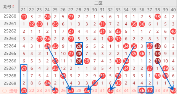 该区间21号数字我们注意一下出号情况,本可以防守一下21 25号数字同出的情况。该区间的27 28 29号数字是属于重号28号数字的回补号码,本期是有机会出一个号码的,我们重点关注一下27 29号数字出一个号码的情况。本期的32号数字我们防守一下出号情况,属于阶梯号码,本期可以防守一下28 32号数字同出的情况。本期的37号数字是属于空二对称号码,本期是有机会出号的,我们可以防守一下36 37号数字同出的情况。