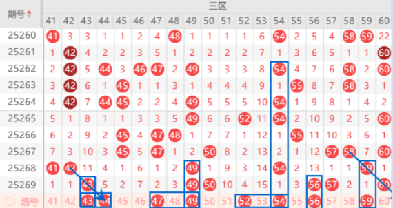 该区间的43号数字我们注意一下出重号的情况,本期可以防守一下43 44号数字同出的情况。本期的47号数字出号机会也是有的,本期可以防守一下47 54号数字同出的情况。本期的52号数字是属于454走势,出号机会也是有的,我们可以关注一下。本期的54号数字是属于121走势,出号机会也是有的,本期可以防守一下52 54号数字同出的情况。上期开出了56 57号数字,本期我们注意一下出一个重号的情况。