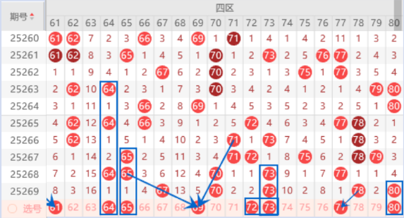 该区间的61号数字我们防守一下出号情况,属于遗漏8期的号码,本期遗漏8期的号码4个,出一个号码的机会很大。本期的64 65号数字我们注意一下出一个号码的情况,其中的64号数字我们可以重点关注一下。本期的69号数字是属于阶梯号码,出号机会也是有的,可以关注一下。本期的71 72号数字我们注意一下出一个号码的情况,其中的71号数字可以重点关注一下。上期开出了73 78 80号数字,本期我们是要注意一下出重号的情况,其中的78 80号数字可以重点关注一下。