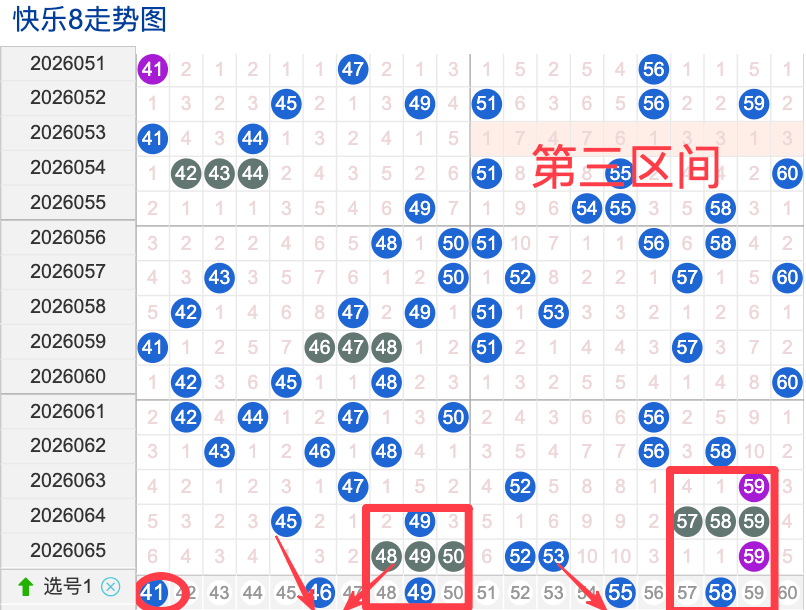 三区间开出了6个奖号(48.49.50.52.53.59)上期回顾三区开出6个奖号上期的三区间的奖号数量呈现一个递增的形态,4头回补2码,本期先来看号码41期出现频率相对来说还是很稳定。偶尔有时间隔期数也是很长,但是在近期的开奖中较温热,号码46在近 30 期内出现次数相对较稳定的号码,近期的活跃度也是较温热。号码49有一定的间歇性,通常间隔5-3期会出现一次,没有明显的连续出现态势,走势相对还是很稳定,在整个第三区间的表现本期还是可以防守的。号码58走势相对近期较热,近期没有连续间隔落号的情况,活跃度近期处于热状态注意防守。