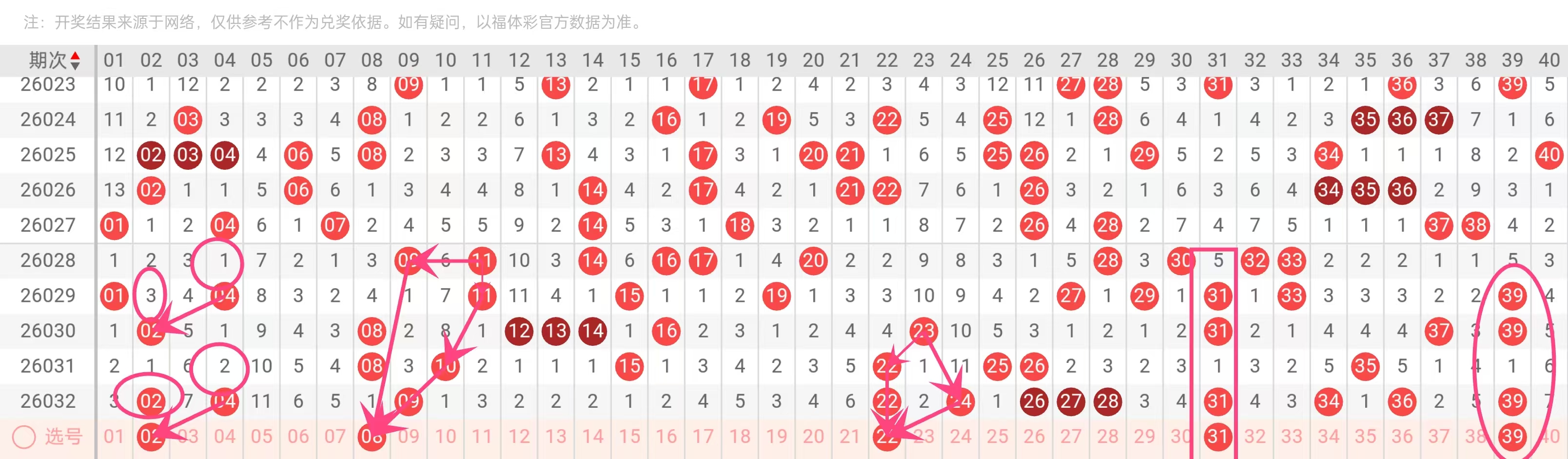 理由:与31类似,5期出现3次(2026032、2026030、2026029期),属于“30-40区间”核心热号。该号在近3期内两次与43、44同出,形成“39-43-44”斜连趋势,且39作为3字头结尾号,常引领后段40-50区间出号,惯性较强。