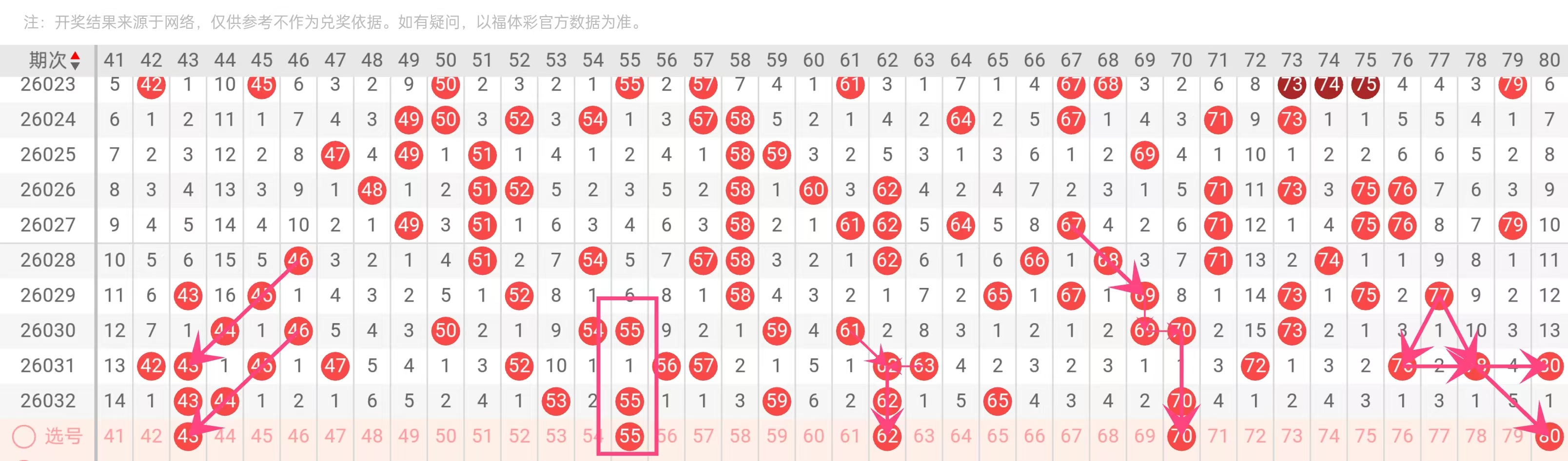 理由:5期出现3次(2026032、2026031、2026029期),是后区(40-80)近期最稳热号。其与44、45等构成“43-45”密集区(2026031期43、45同出),且常与55、59等同尾数号联动,下一期有望继续作为后区锚点。