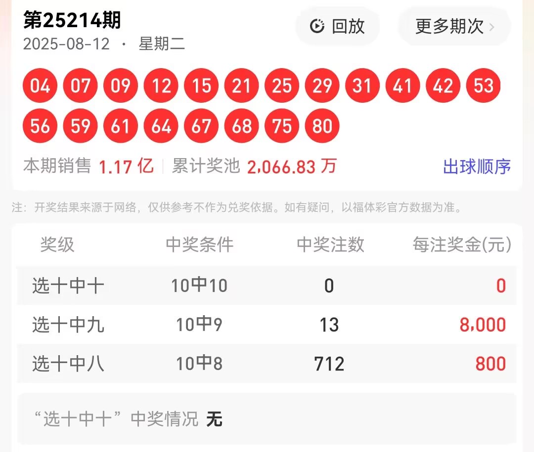 上期福彩快乐8第 2025214期开奖号码为【04 07 09 12 15 21 25 29 31 41 42 53 56 59 61 64 67 68 75 80】,其中大小比为11:9,奇偶比为13:7,和值为819,跨度为76,四区间比为5:4:5:6。下面是对本期对于 01 - 80 的四个区间进行详细分析。