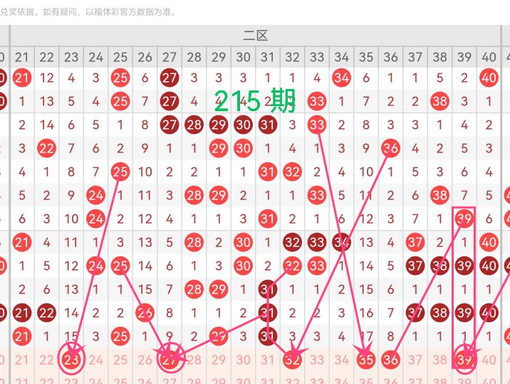 21-40区间,上期仅开出4个号码(21 25 29 31),此区间出号较少,短期内过热,本期此区间可能会减少开出。这个区间最大的特点就是容易出现等距斜连和遗漏号码回补以及重号的情况。号码31带动斜连号码32的出现,号码35遗漏17期,号码27遗漏9期,号码36遗漏8期,这几个号符合“遗漏回补”规律。号码39在画线上呈现较好的走势,有可能在本期再次出现。因此综合推荐该区间号码【23 27 32 35 36 39】