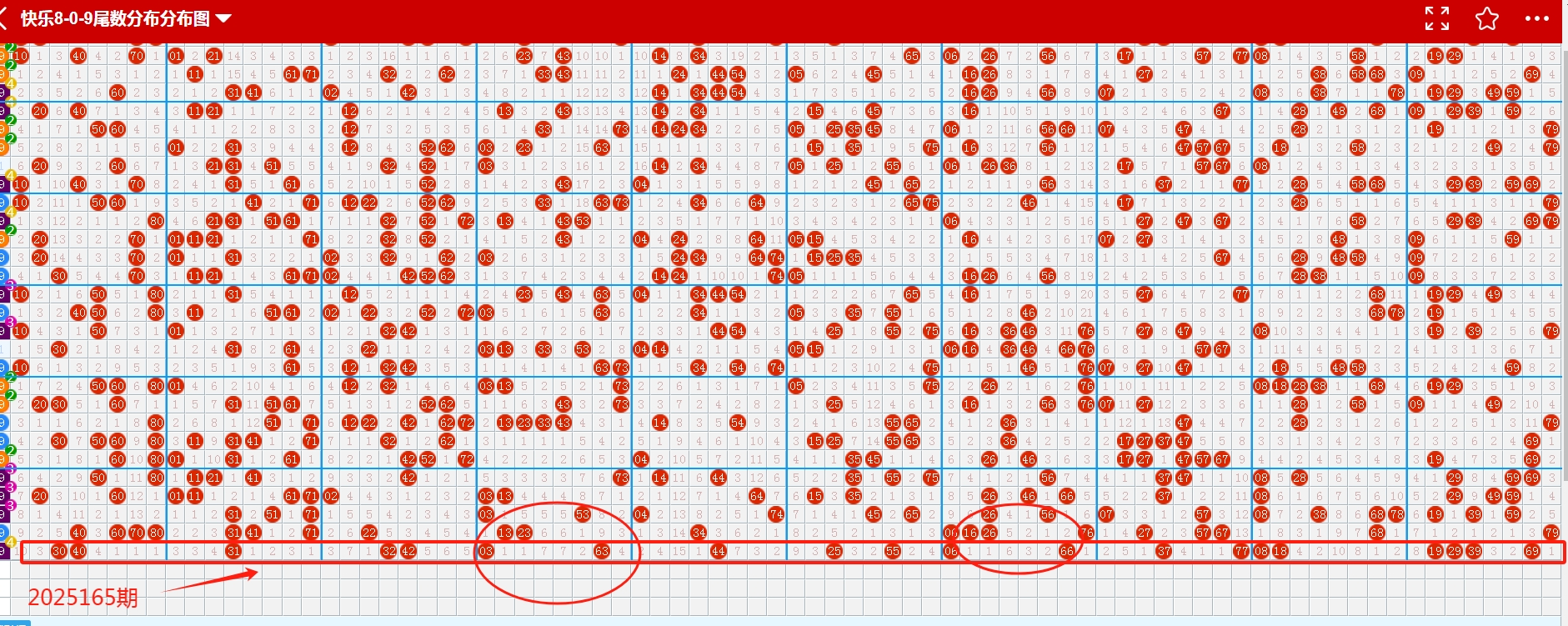 上图是快乐八2025165期的尾码走势图,从图中看0尾到9尾出号个数依次是:0尾号码区开出2个;1尾号码区开出1个;2尾号码区开出2个;3尾号码区开出2个;4尾号码区开出1个;5尾号码区开出2个;6尾号码区开出2个;7尾号码区开出2个;8尾号码区开出2个;9尾号码区开出4个;再看小尾号码(0尾-4尾)区有8码,大尾号有12码;数据比对统计后可以看到9尾出号数量最多,开出了4个中奖号码。本期没有出现断区!由走势比对推断20250166期重点需要关注3、6尾区号码下号热度和增加的概率较大。