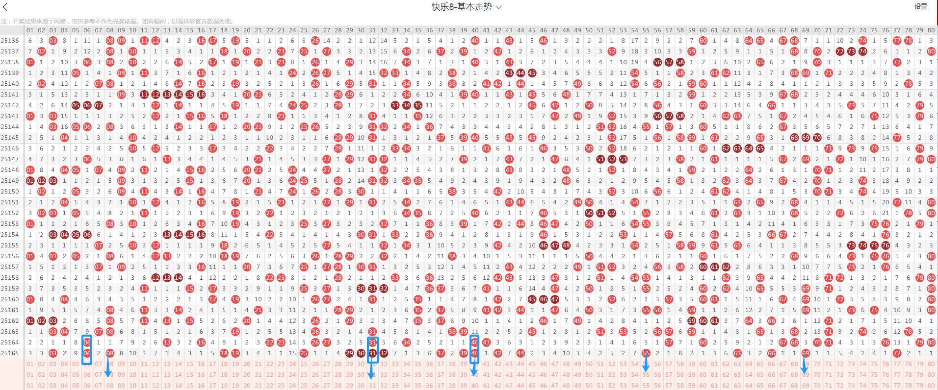 从2025165期重码走势图上看,画蓝色方框图标的是开出来的重码,开出了3个(蓝色方块标示的),重码数量与上期减少;主要分布位置集中在一、二区域下号。从重码图上看,近5期重码下号数量有转暖的趋势。但近期重码下号数量比对,发现在2-10个号码之间均衡下号,所以本期判断重码延续概率极大,可以参考5个左右(蓝色箭头标示的);建议多加关注(08、31、40、55、69);