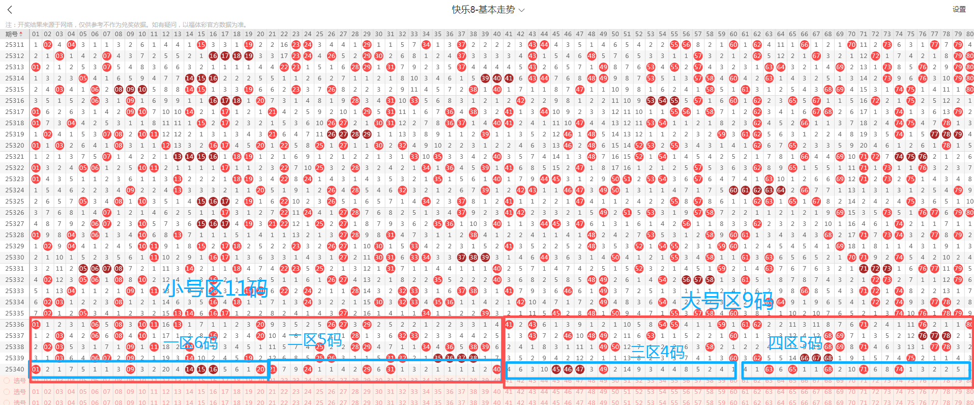 上图是快乐八2025340期区间走势图,从图中看到小号区(1-40)开出11个出奖号码,从开出数量上看与上期开出数量减少,热度上降温,从小号区近10期出号情况看,整体小号区前区近期偏温趋势;大号区(41-80)本期开出了9个出奖号码,从开出数量上看与上期开出数量增加,热度升温,从近期出奖号码个数看属于偏温态势,下期快乐八2025341期大号区号码大概率热度回温延续,大小区间主看大区号码热度回温概率较大,大小比具体区间比可参考11:9,防10:10的比例;再从细分区间来判断,按走势图四分区分成四个区间,一区(1-20)开出来的号码有6个;二区(21-40)开出来的号码有5个;三区(41-60)开出来的号码有4个 ;四区(61-80)开出来的号码有5个;数据上看本期出奖号码集中分布在一区。从号码落位区间形态上看,快乐八2025341期主看二、三区热度回暖的态势,落号几率较大,建议密切关注。