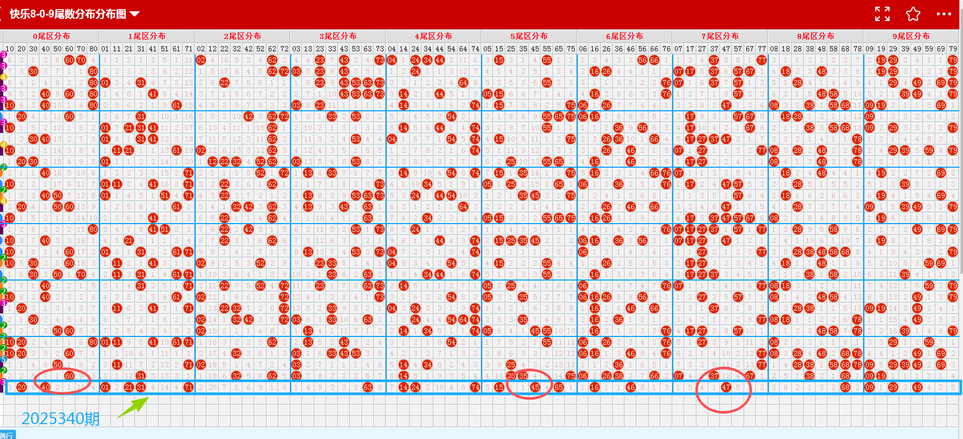 上图是快乐八2025340期的尾码走势图,从图中看0尾到9尾出号个数依次是:0尾号码区开出2个;1尾号码区开出4个;2尾号码区开出0个;3尾号码区开出1个;4尾号码区开出3个;5尾号码区开出3个;6尾号码区开出2个;7尾号码区开出1个;8尾号码区开出1个;9尾号码区开出3个;再看小尾号码(0尾-4尾)区有10码,大尾号码(5尾-9尾)有10码;数据比对统计后可以看到本期1尾出号数量最多,一共开出了4个中奖号码。本期2尾出现断区!由走势比对推断2025341期重点需要关注0、5、7尾区号码下号热度回补和落号数量增加的概率较大。