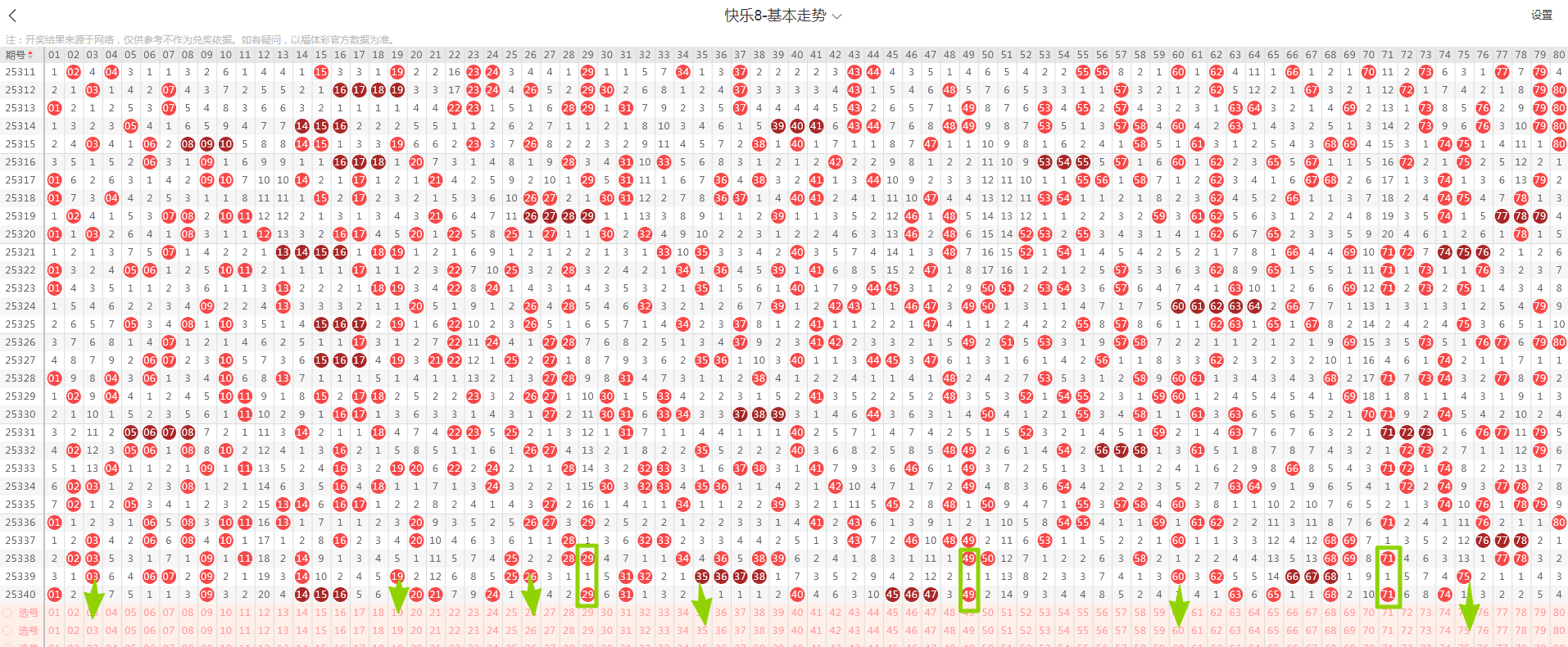 从这张走势图可以看到我画标出来了遗漏示意号码,开出了隔期(遗漏一期的)3个号码(绿色方块标示的),数量与上期一致,从近期走势图看隔期码回温态势形成,本期判断热度回温,落号6个号码概率较大(绿色箭头标示的03、19、26、35、60、75)需要关注,有下号概率;
