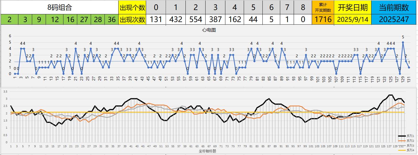 先来看一下8码组合(02,03,09,12,16,27,28,36)的心电图,如下: