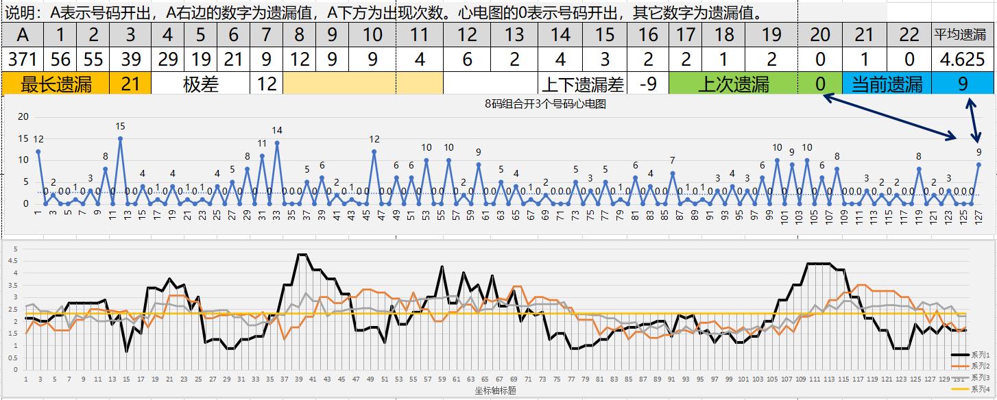 历史上这8码开3码合计开了371次,平均大概每4.63期就会开一次。当前遗漏9,就是已经有9期未开3码组合了,而从图形上刚看,最近几个月时间,遗漏峰值仅为10,当前遗漏9,算是天花板下的遗漏值了,本期和下期均有机会。
