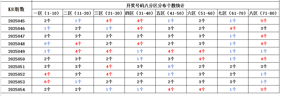 通过分析开奖号码,分享第一个数据分析:统计开奖号码的八分区冷热走势,判断出号规律。上期开奖号码八分区走势较热的区间:五区、六区、八区,区间号码开4-5个;走势较冷的区间:三区、四区、七区,区间号码开出1个。以近10期开奖号码的八分区统计数据为例: