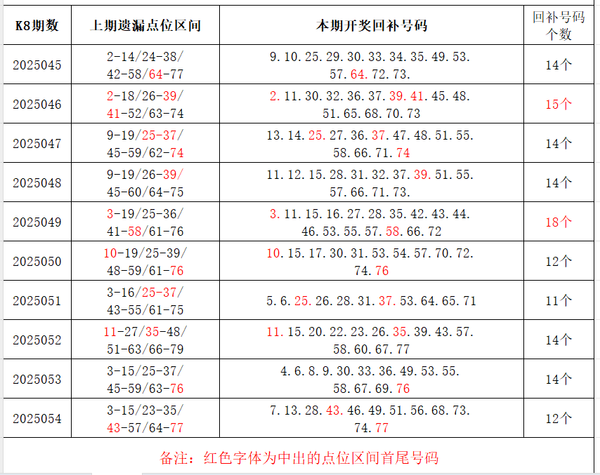 如图,上期的遗漏号码在下期开出10个左右,即为回补号码。定准点位区间首尾号码是关键!以上期2025054期(会员专区数据)为例,定位4个遗漏区间,围12码!结合上期开奖号码,以跨度值大于或等于7为依据,本期关注4个遗漏区间:13-20/20-28/28-39/60-68;重点关注遗漏区间:****(会员专区可见),区间遗漏号码可能在本期回补开出。注意区分遗漏区间回补号码和大底号码,不要混淆。个人分析,仅供参考。