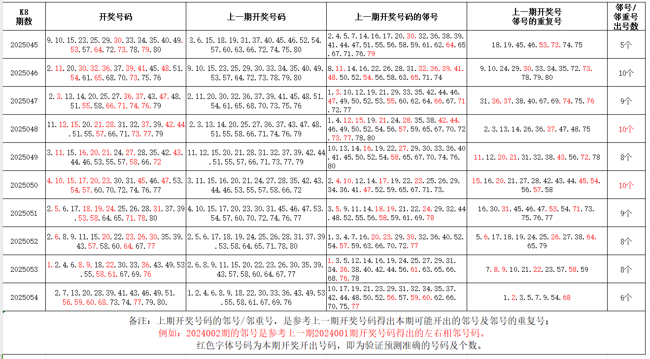 如图,红色字体是上期邻号、邻重号在下期开出,每期开出10个左右。上期邻号开出4个,邻重号开2个。本期参考邻号:1.3.6.8.12.14.19.21.27.29.38.44.45.47.48.52.55.57.58.61.67.69.72.75.76;邻重号:40.42.50.59.60.73.74.78.79.80;个人分析,仅供参考。