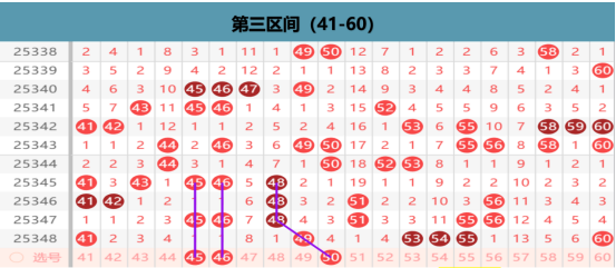 本区上期开出6码的区间布局,那么在本期我们优先考虑的就是41 60的龙头位置上的出号布局的重点,优先考虑一码的下方出号,所以这个位置上我们是要考虑做容错的呼号点位的,在53 54 55的出号点位上,我们考虑一码走重的可能性,接力重码的出号的,在空位上关注的就是45 51的三同路的分边出号,我们优先考虑的就是分边的出号,44 46 50 52的择一出号的选择,那么其他位置上的出号就不是我们考虑的重点位置了。