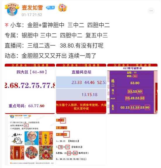 大家好,我是主播壹发如雷是一个稳重求胜的快乐8荐号主播,人称两胆大魔王,新的一年,祝福每一位彩友,新岁启幕,福气满盈!愿 2026 年的你们,不仅能收获彩票带来的惊喜,更能拥有生活里的每一份顺遂,发财暴富,幸福安康!每天17点直播间,一起来淘号选号.