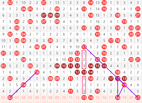 快乐8第2026018期01-20区域,今天一区推荐的第一个是02号,大家可以看到他有一个06,间隔一期开出04,再间隔一期开出02的走势下来就是13号上下对称的一个走势,上下都是间隔三。然后是18号他跟19号有一个经典的三角夹角,最后就是21号一个斜连的对称。