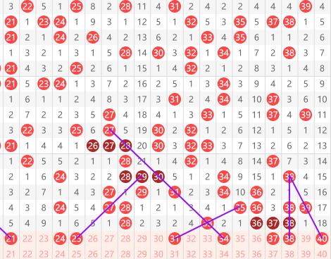 快乐8第2026018期20~40区域,二区推荐的第一个号码是25号,我们看到24号是一个间隔一的走势。还有可能本期24.25同时开出。然后就是31号,一个35间隔一出33,再间隔一出31的一个间隔一斜连,还有34号我们看到的一个两斜连间隔一对称。后面就是38和40,大家可以看到一个三角形的走势。