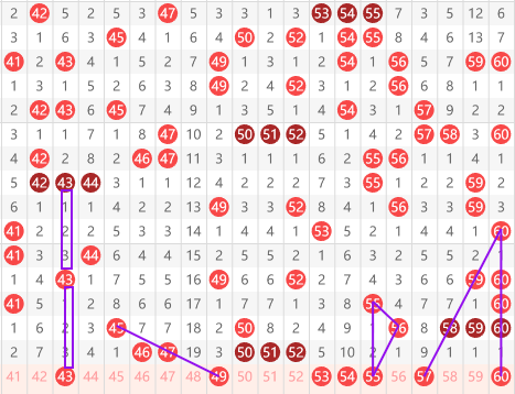 快乐8第2026018期41-60区域的推荐如上图,三区推荐的第一个号码43号,它是一个间隔3的对称轴式,然后就是49号有一个间隔一的斜连走势,可以看到45间隔一给出 47,再间隔一给出49的走势。接下来就是55号,他和56之间的一个经典的三脚夹角走势。然后就是57和60两个号码,大家看到它和上面的走势形成了一个经典的三角走势。